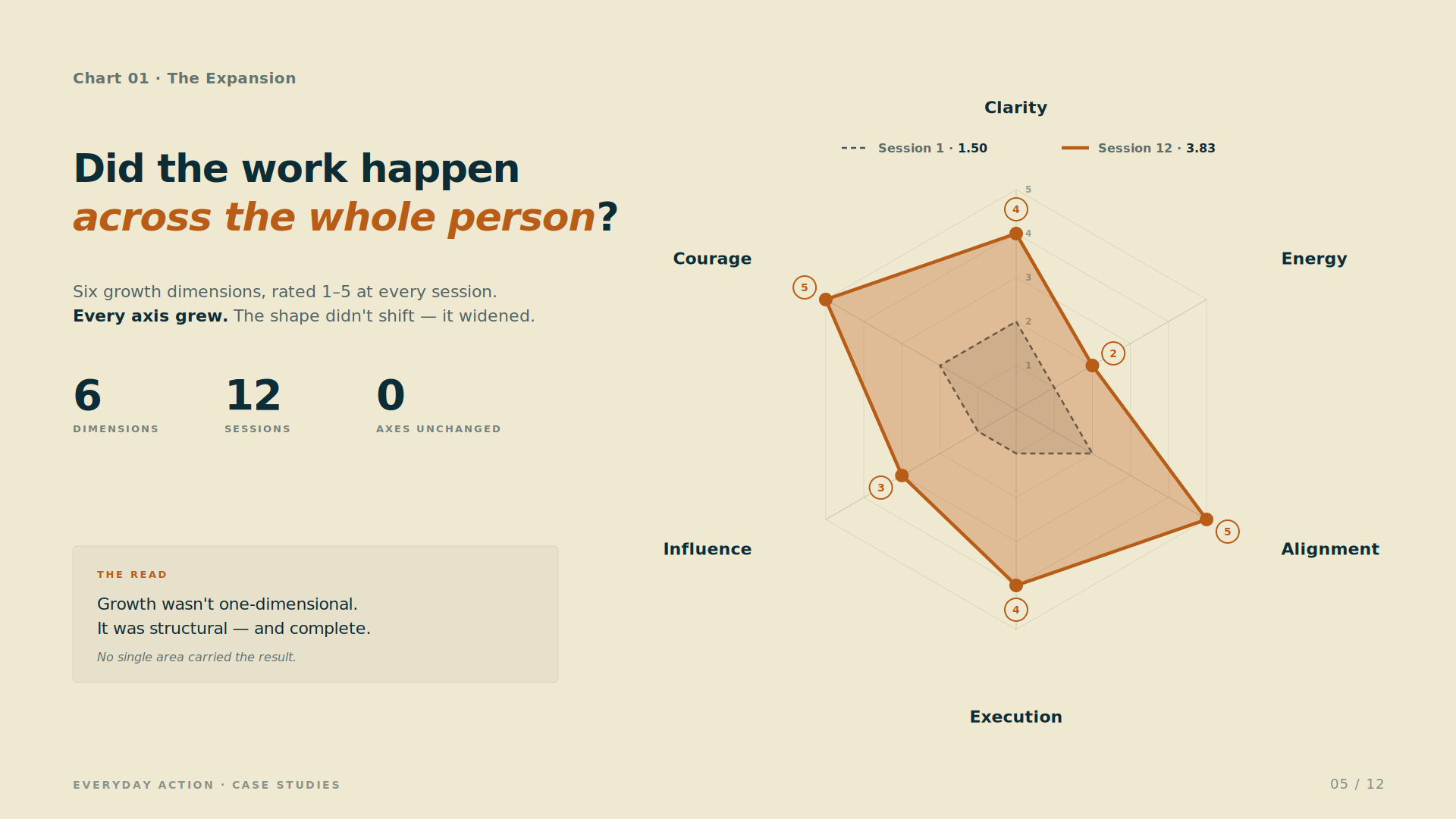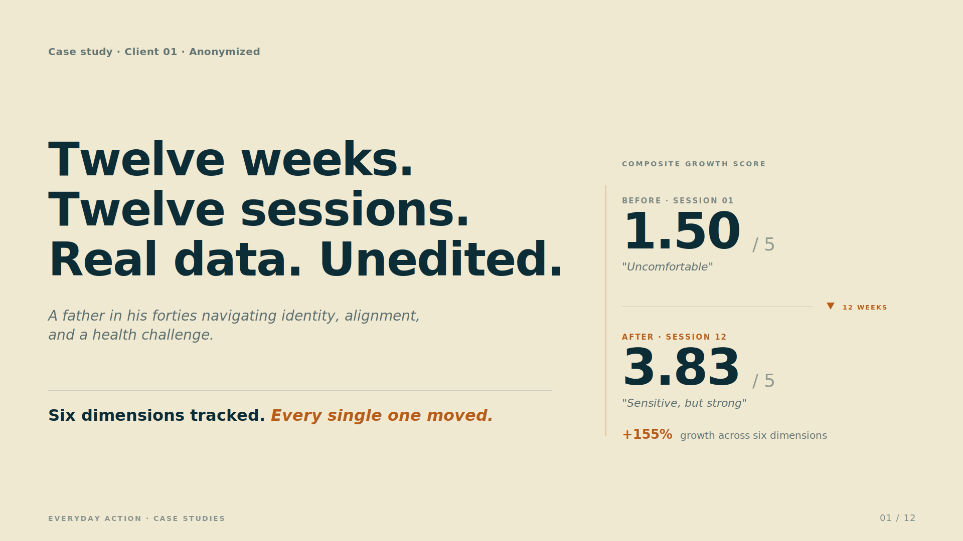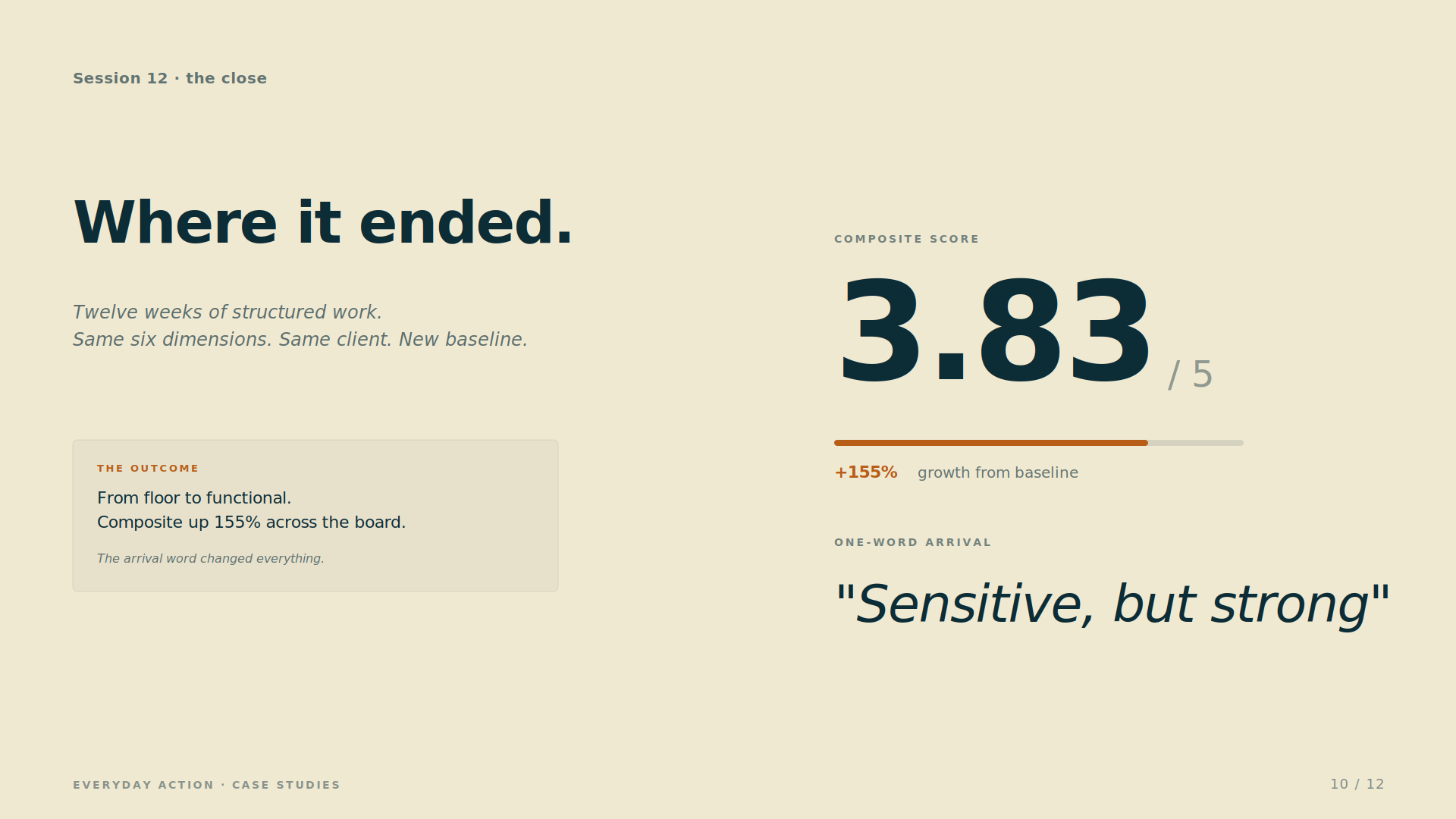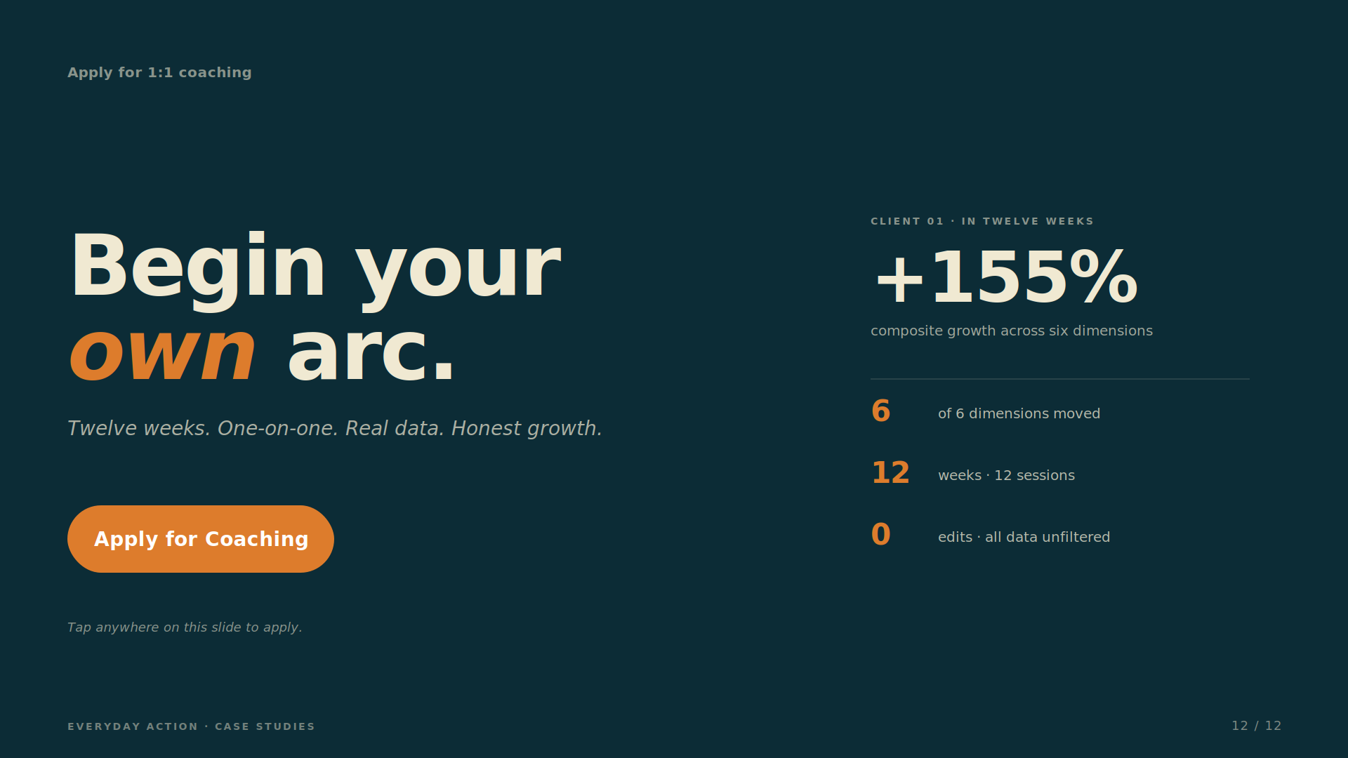 Twelve weeks. One-on-one. Every session builds on the last. Progress tracked across all eight pillars โ assessed at the start, measured at the end. You'll see exactly where you moved and why. Limited spots. Application only.