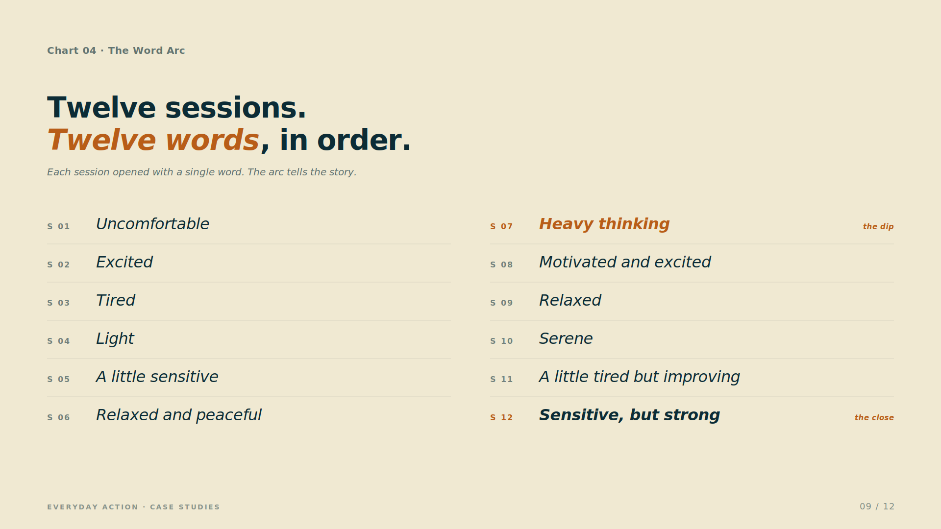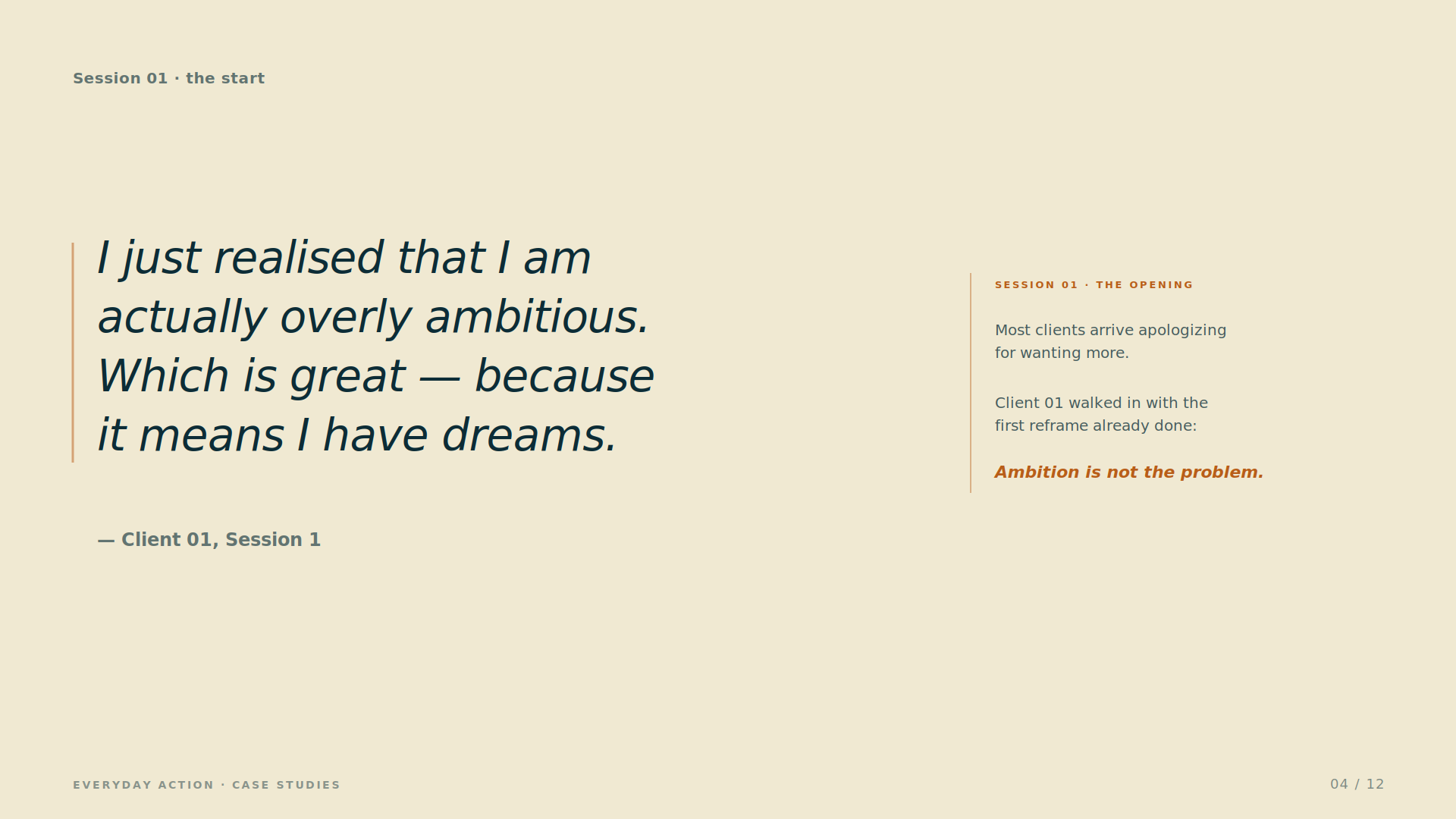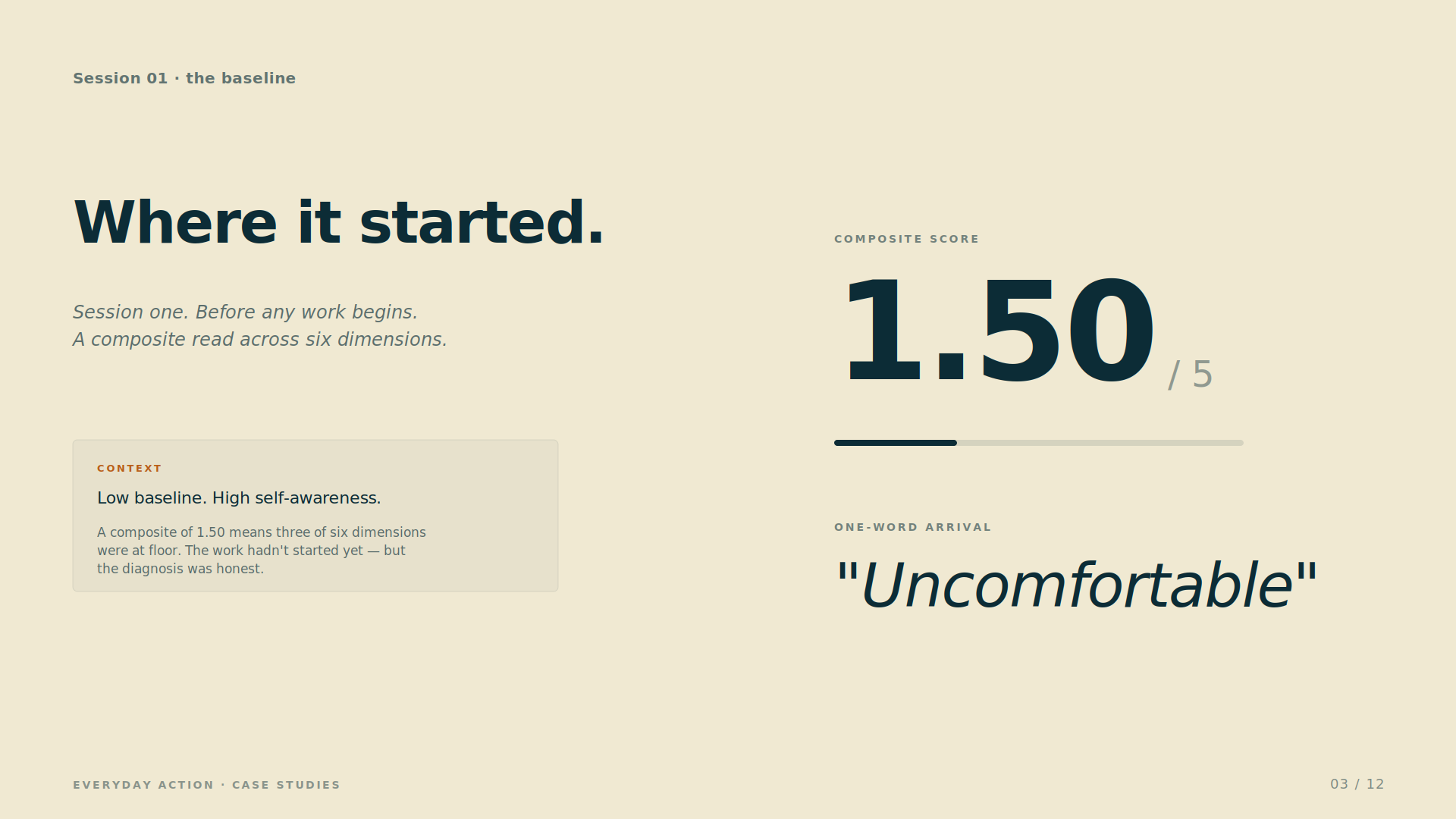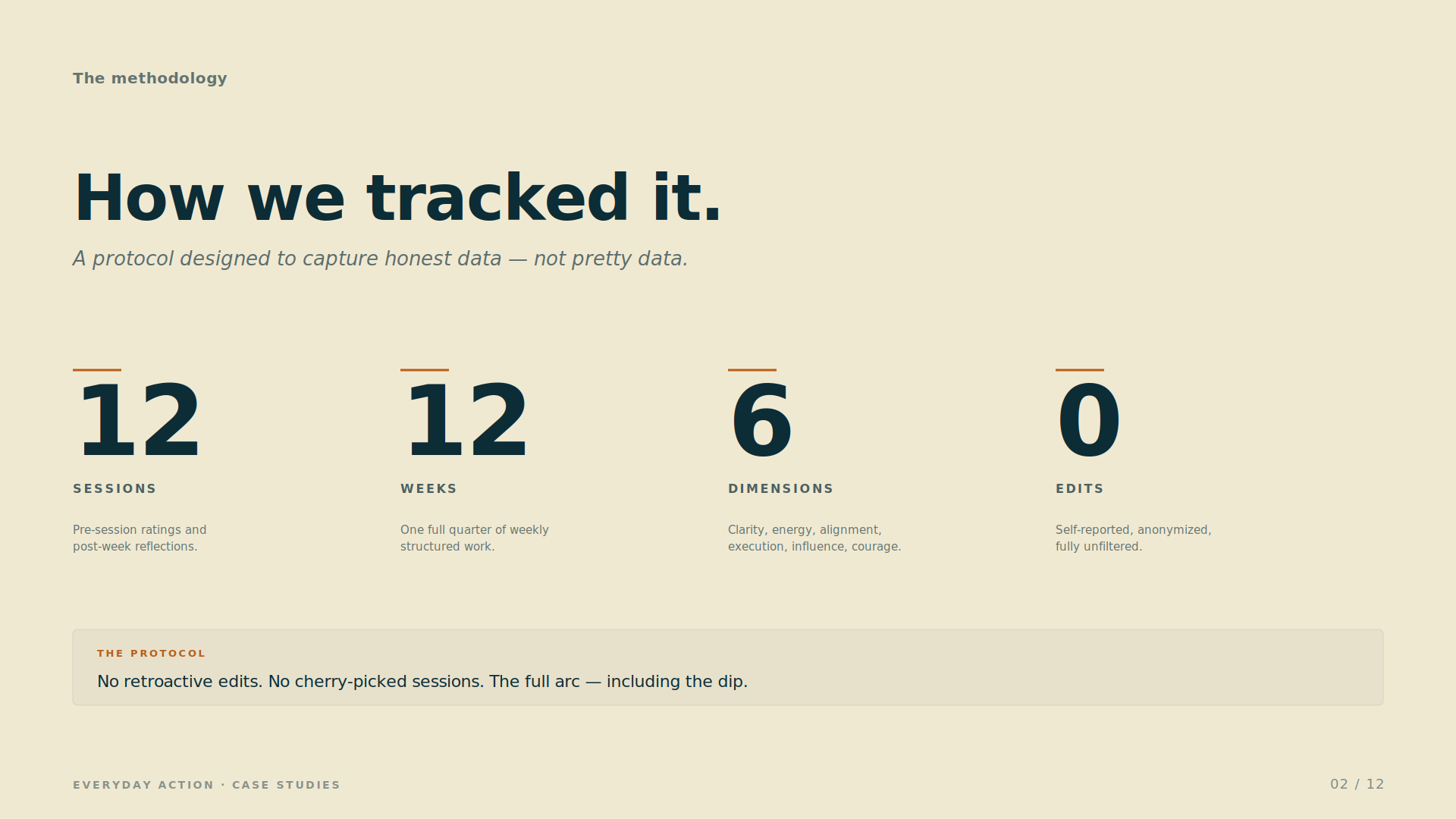 Twelve weeks. One-on-one. Every session builds on the last. Progress tracked across all eight pillars โ assessed at the start, measured at the end. You'll see exactly where you moved and why. Limited spots. Application only.