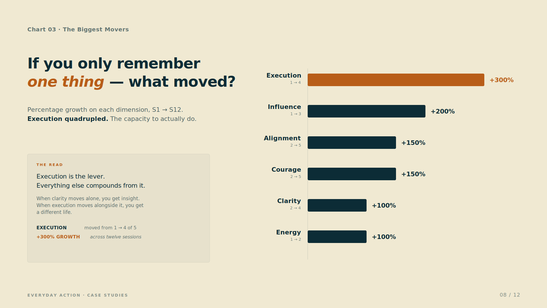 Through The Growth Blueprint, we rebuild from the ground up. Vitality before values. Values before goals. Goals before execution. Twelve weeks of structured, sequenced work โ so by the end, the life you're running is one you actually chose.