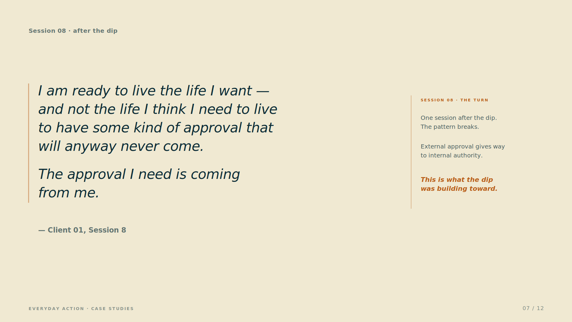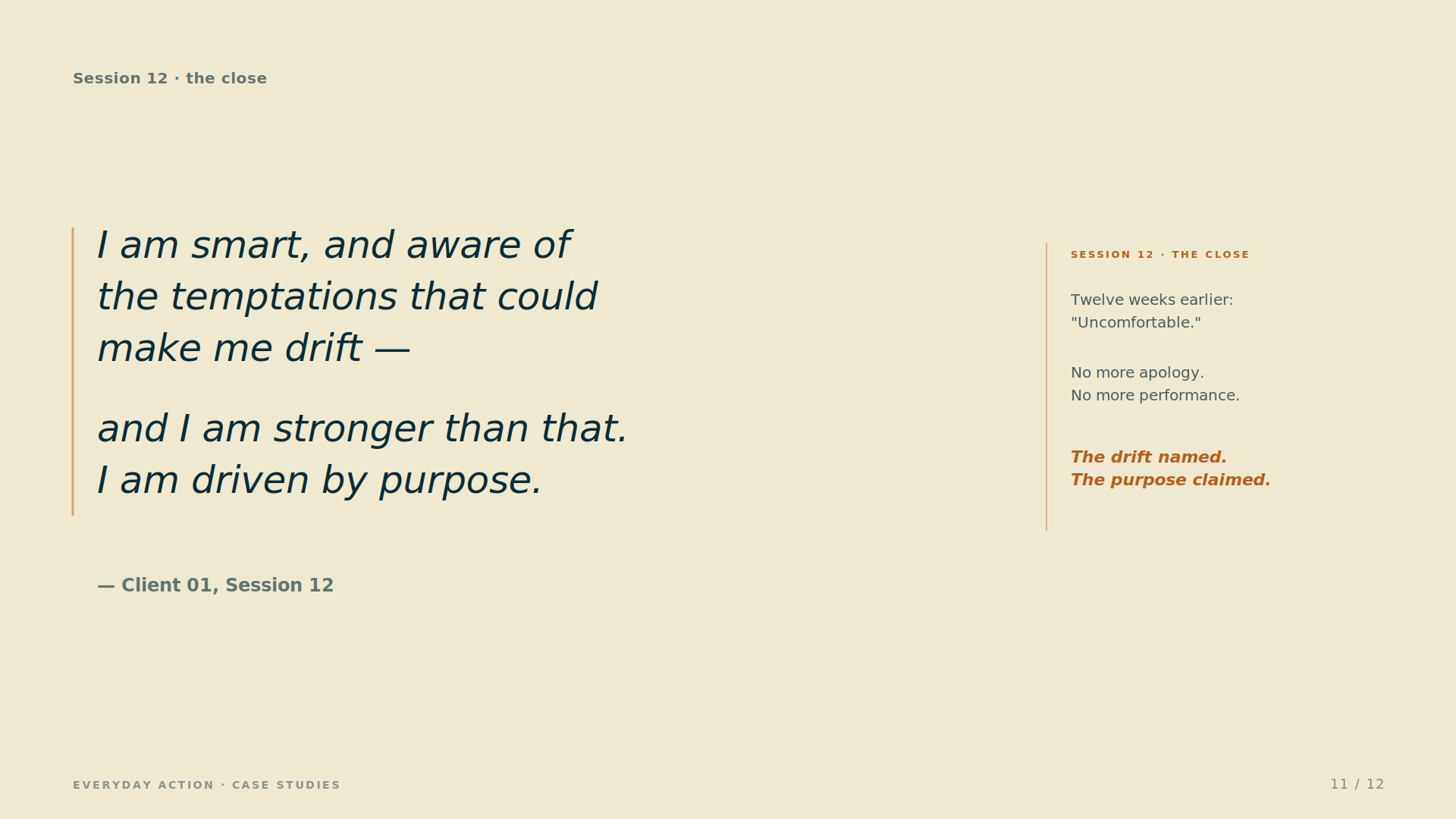 You wake up knowing who you are. Not performing a role. Not running on momentum you didn't choose. Grounded in what actually matters to you โ and clear on what doesn't.